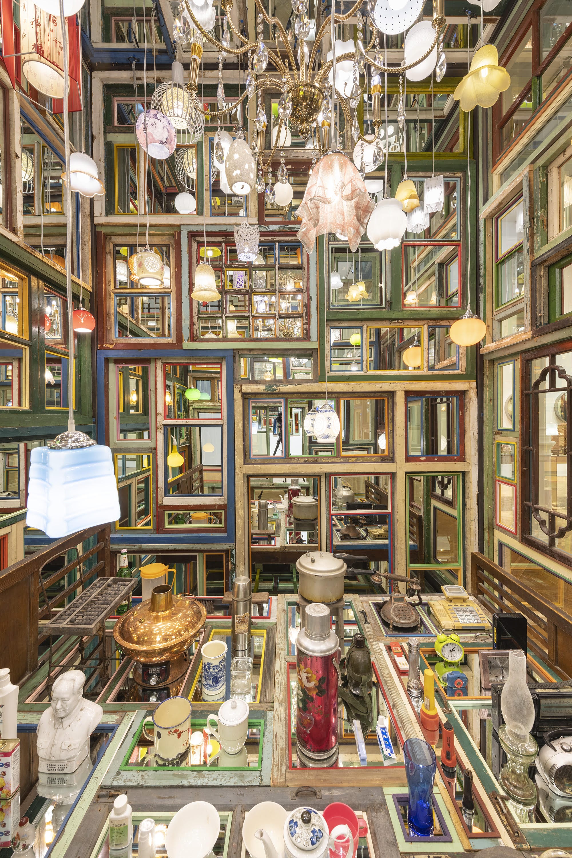 In his work Quarter (2021-2024), the artist constructs an interactive installation using steel, mirrors, and everyday items and furniture collected from various households. This approach not only showcases the diversity of material culture but also reflects the collective memory of urban life.