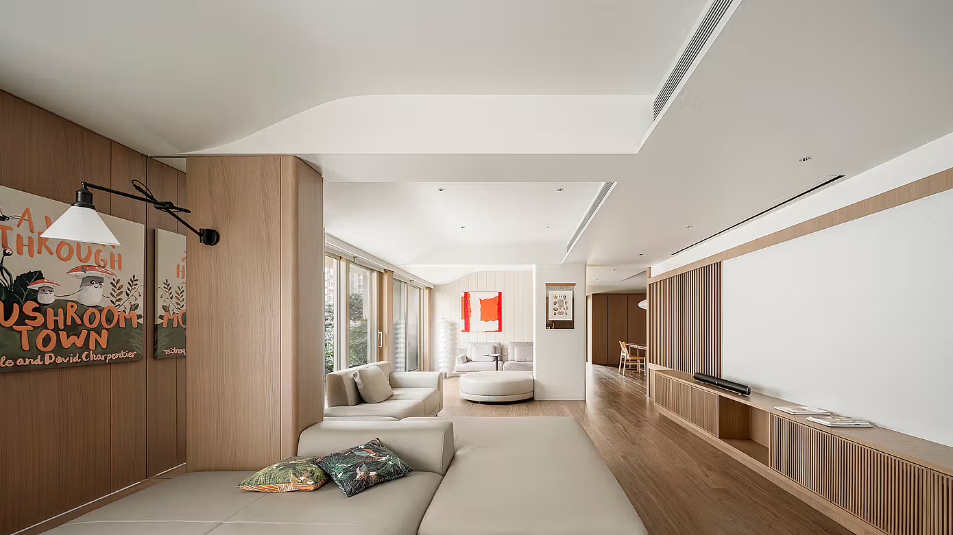 Foshan’s “Innocent Dwelling” (c.dd design) transforms 286㎡ into a vertical nature school. The entryway’s moss wall tracks children’s height, while the dining bay window opens for mint planting. The study’s pièce de résistance is a bookcase hiding a slide—siblings often tumble into the living room as if through a “knowledge waterfall.”