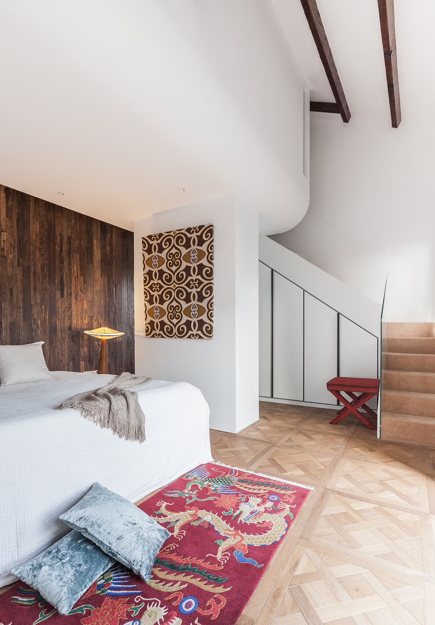 The designer preserved the old stained-glass window on the staircase landing, casting traditional patterns on the new teak floor with German joinery. This “old-new symbiosis” is more than a simple mix: Ming-style cabinets house German kitchen appliances, while handmade rice paper lamps in the yoga area cast ink-wash-like shadows on concrete walls.