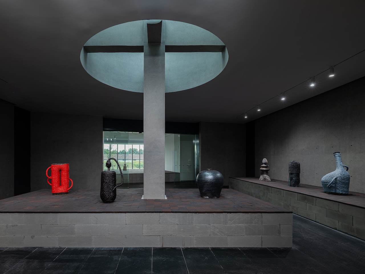 Theaster Gates, Composite Meditation, 2025, 4 pieces wood-fired stoneware with manganese glaze; 3 pieces wood-fired stoneware and leather; 1 stoneware with glaze; bricks. Courtesy of the artist. Image Courtesy of Jia Yuan Hai Art Museum.