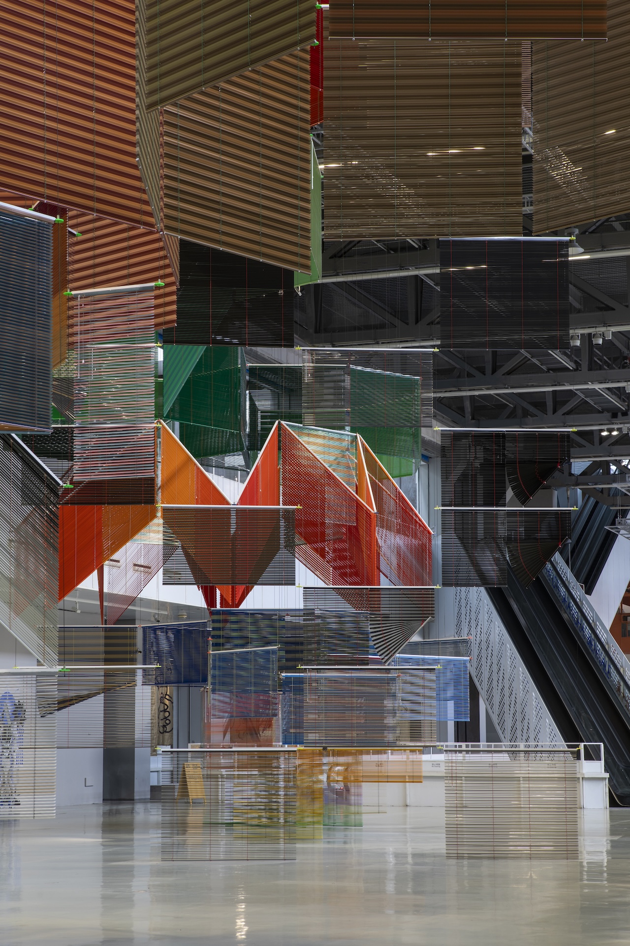 Haegue Yang, Accommodating the Epic Dispersion – On Non-Cathartic Volume of Dispersion, 2012, aluminum venetian blinds, powder-coated aluminum hanging structure, steel wire rope. Courtesy of the artist. Image courtesy of Power Station of Art.