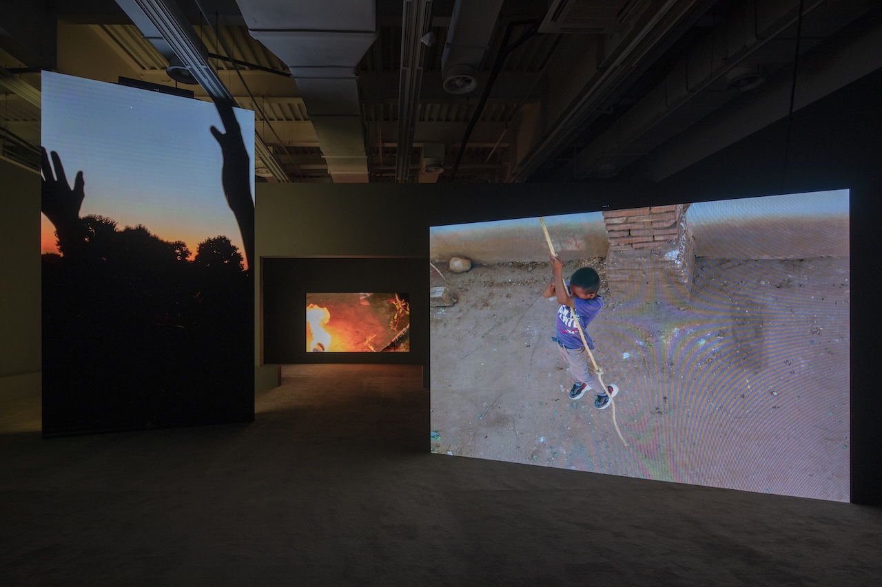 Installation view of Francis Alÿs, Children’s Game #30: lmbu, D.R.Congo, Children’s Game #52: Boy and Bell, Mexico, and Children’s Game #44: Uárhukua, Mexico at the 15th Shanghai Biennale Does the flower hear the bee?, 2025, Power Station of Art. All works courtesy of the artist. Image courtesy of Power Station of Art.