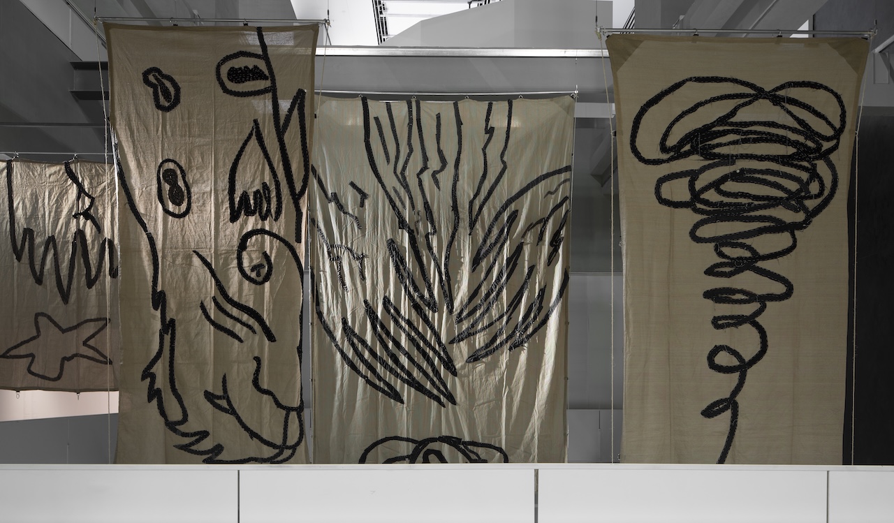 Abraham González Pacheco, Consigna al viento (Windborne Message), 2024, 10 pieces of high density polyethylene shade cloth with hand-stitched fabric patterns on the surface. Courtesy of the artist and Campeche. Image courtesy of Power Station of Art.