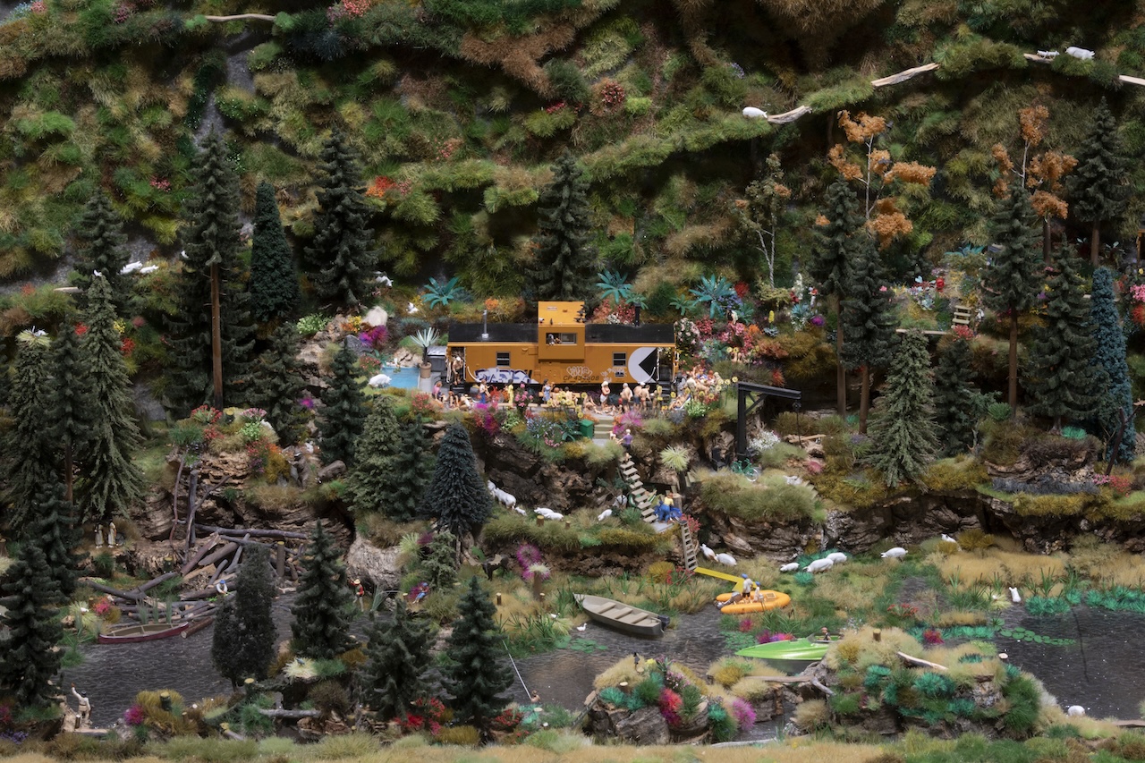 Kim Adams, Arrived (Formerly Known as Pig Mountain), 2014-2025, HO 1/87 scale miniature models, faux rock, landscape materials, cork bark, powdered pigments. Courtesy of the artist and Hunt Gallery. Image courtesy of Power Station of Art.