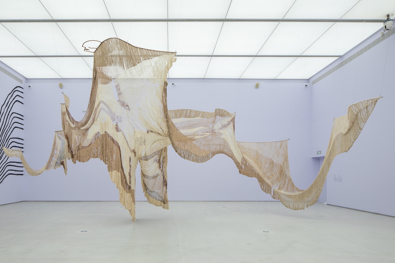 Cristina Flores Pescorán, Abrazar el sol (Embrace the Sun), 2023-2024, native Peruvian cotton,threads dyed in purple corn, copper rods. Commissioned by the Biennale of Sydney and the Fondation Cartier pour l’art contemporain. Courtesy of the artist. Image courtesy of Power Station of Art.